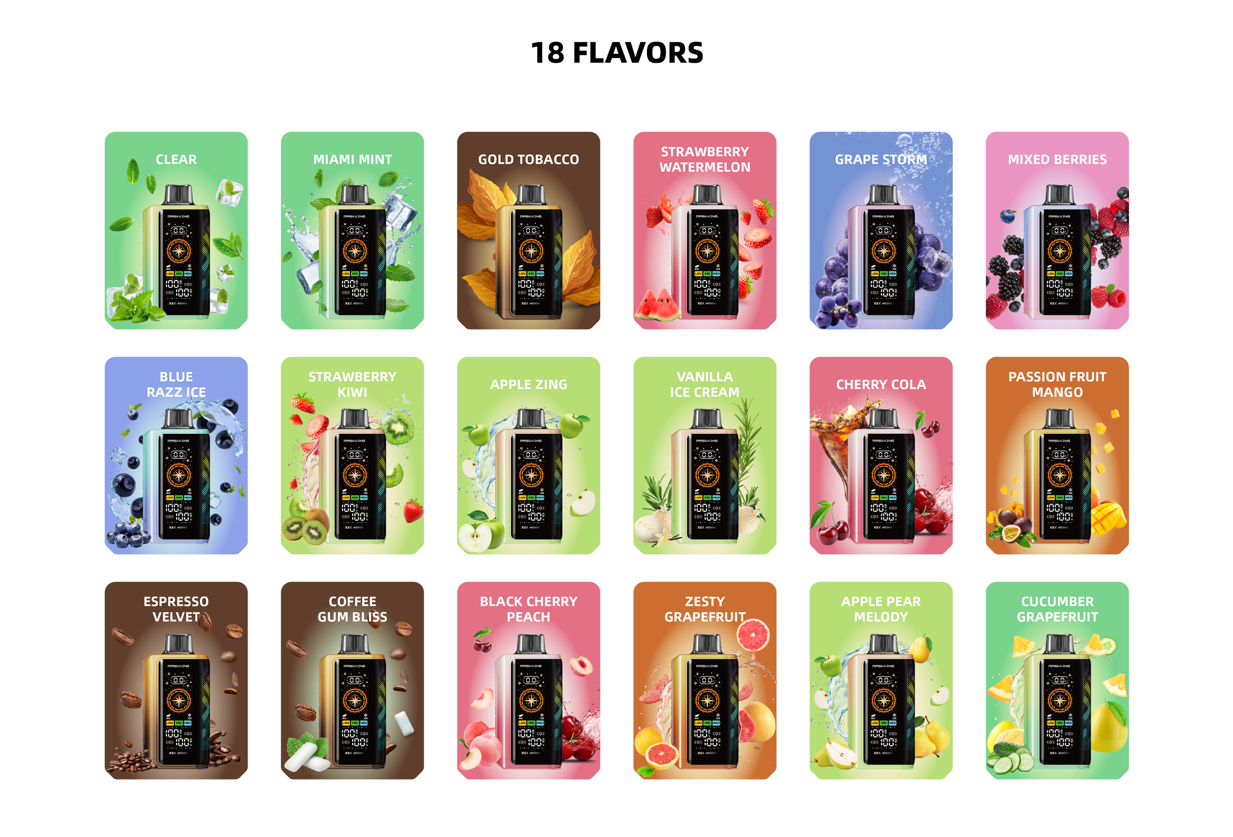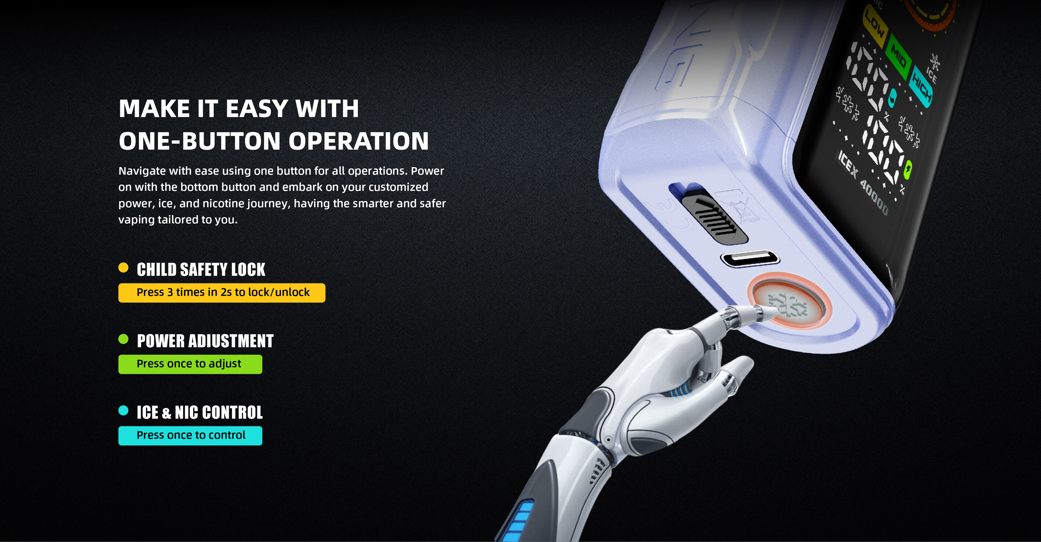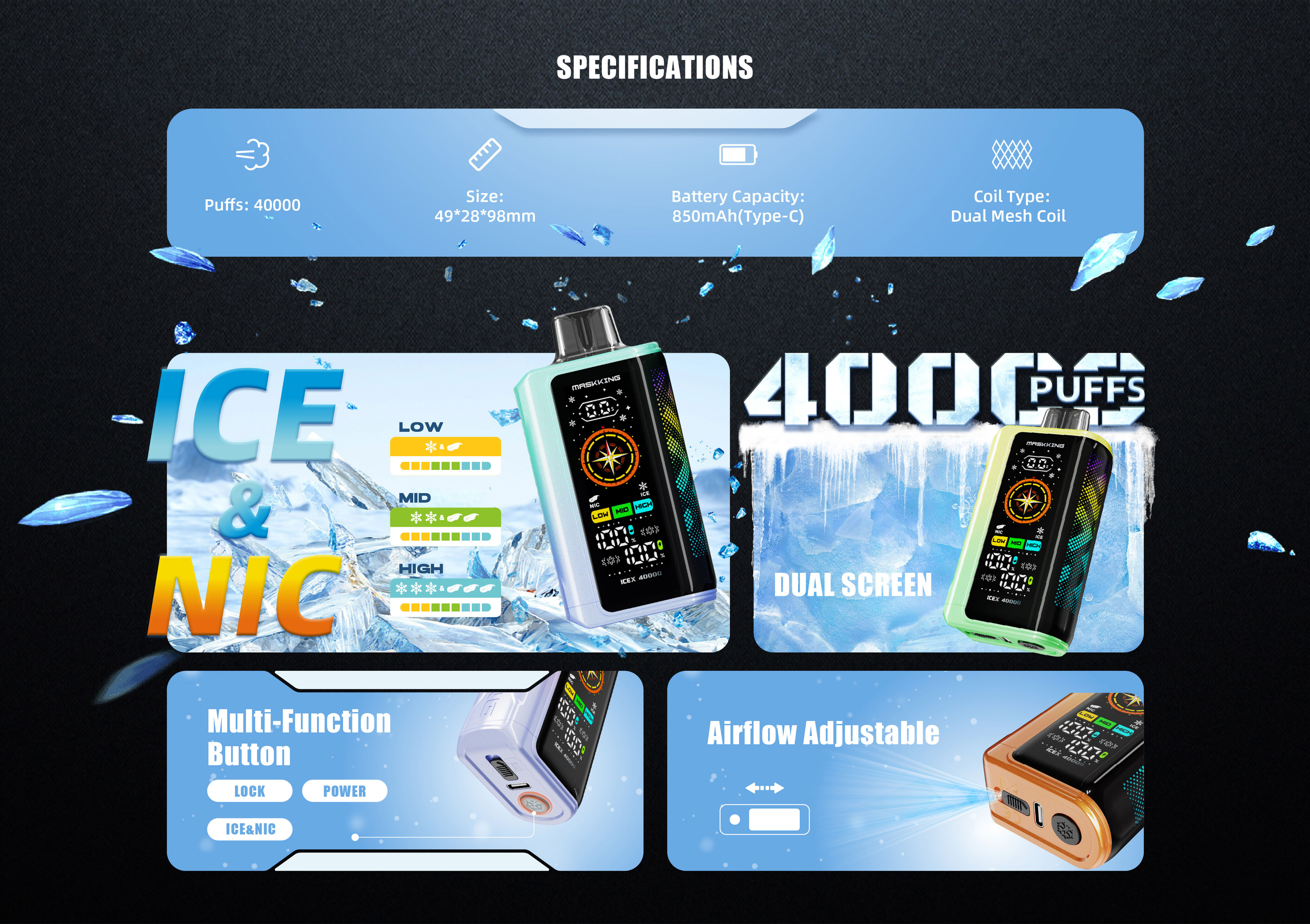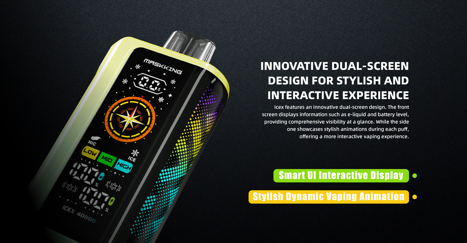 - Die Icex 40000 besticht durch ihr innovatives Dual-Screen-Design. Das Frontdisplay zeigt Informationen wie den Akkustand an und bietet so umfassende Übersicht auf einen Blick. Das seitliche Display hingegen präsentiert stilvolle Animationen bei jedem Zug und sorgt so für ein interaktiveres Dampferlebnis.