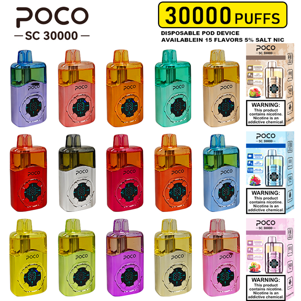 - Der POCO SC30000 Puffs ist ein beeindruckendes Einweg-Vape-Gerät, das bis zu 30.000 Züge mit 30 ml vorgefülltem E-Liquid ermöglicht. Er verfügt über einen integrierten 650-mAh-Akku mit bequemer Typ-C-Ladefunktion und ist mit einer Mesh-Coil ausgestattet, die große, dichte Wolken und ein verbessertes Dampferlebnis liefert. Der POCO 30000 Puffs verfügt außerdem über ein Smart-Display, das sowohl den E-Liquid- als auch den Akkustand anzeigt. Bunte Lauflichter auf dem Display sorgen beim Dampfen für zusätzlichen Stil. Mit 5 % NCT-Konzentrat und 15 köstlichen Geschmacksrichtungen zur Auswahl bietet der POCO SV30000 ein zufriedenstellendes und optisch ansprechendes Dampferlebnis.